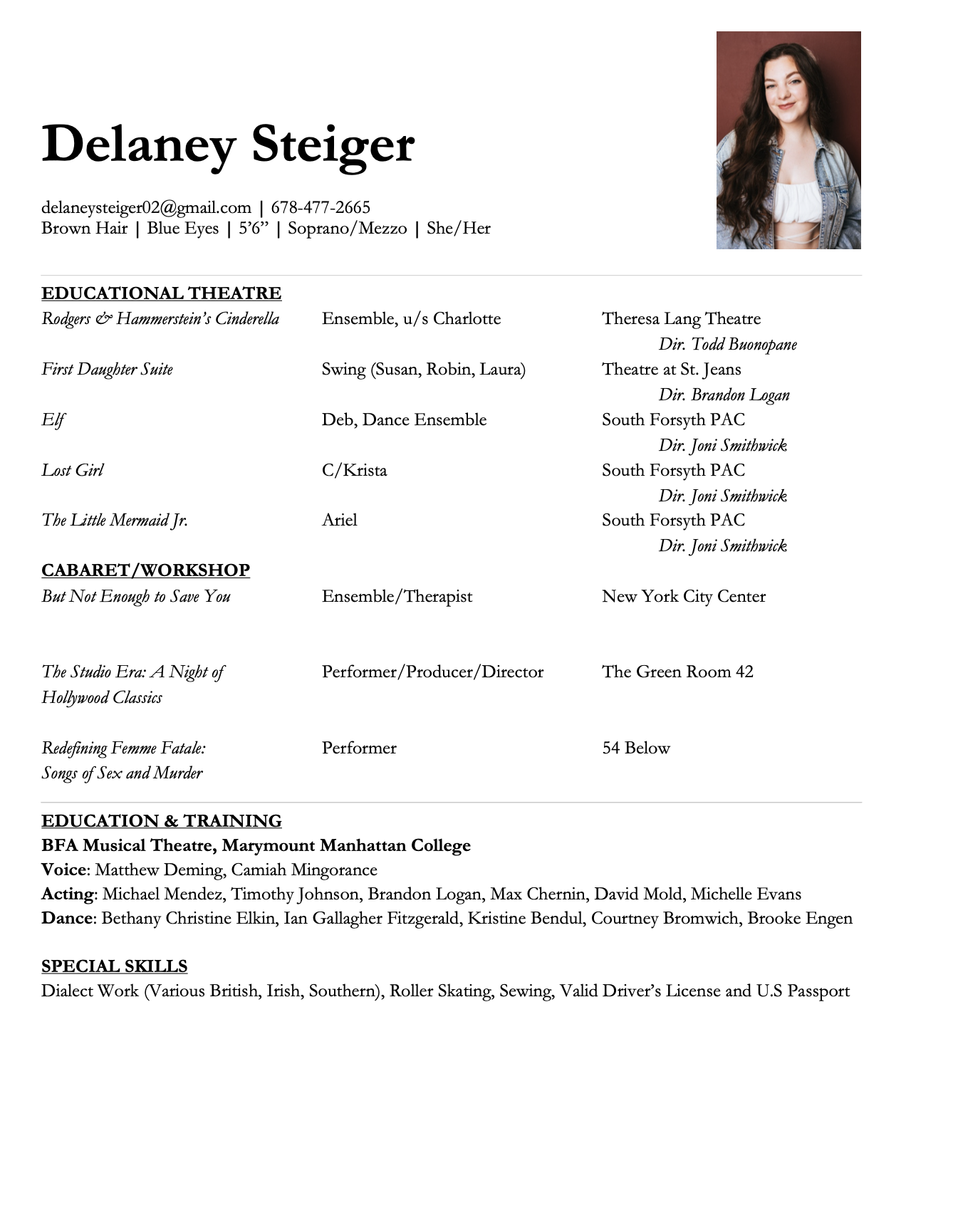 I’m Delaney and I’m currently residing in New York City! I moved from Atlanta, Georgia to the city to attend Marymount Manhattan College, where I earned my Bachelor in Fine Arts in Musical Theatre and a minor in Communication and Media Arts.
